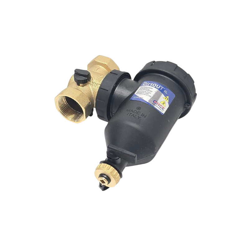 DirtOut levereras med två filter, 500µm och 800µm, och med en kraftfull magnet på 14000Gauss. DirtOut är försedd med avtappningsventil och luftning på toppen. Max flöde 6,9m3/h.