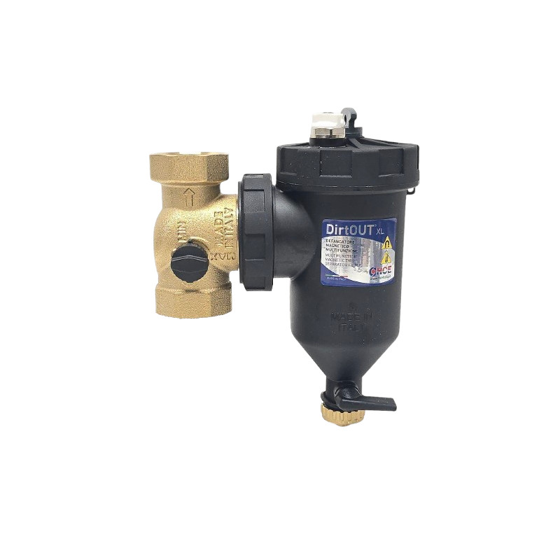 DirtOut XL multifunktions smutsavskiljarfilter med magnet för pannor och värmepumpar. Anslutning DN32. Denna modell levereras inte med avstängningsventiler.