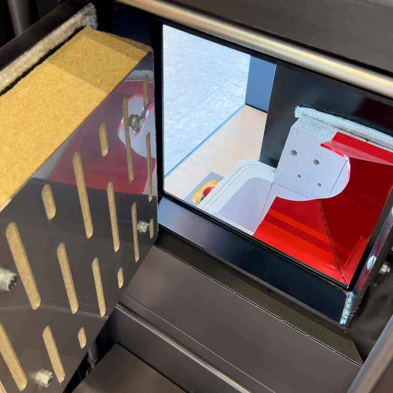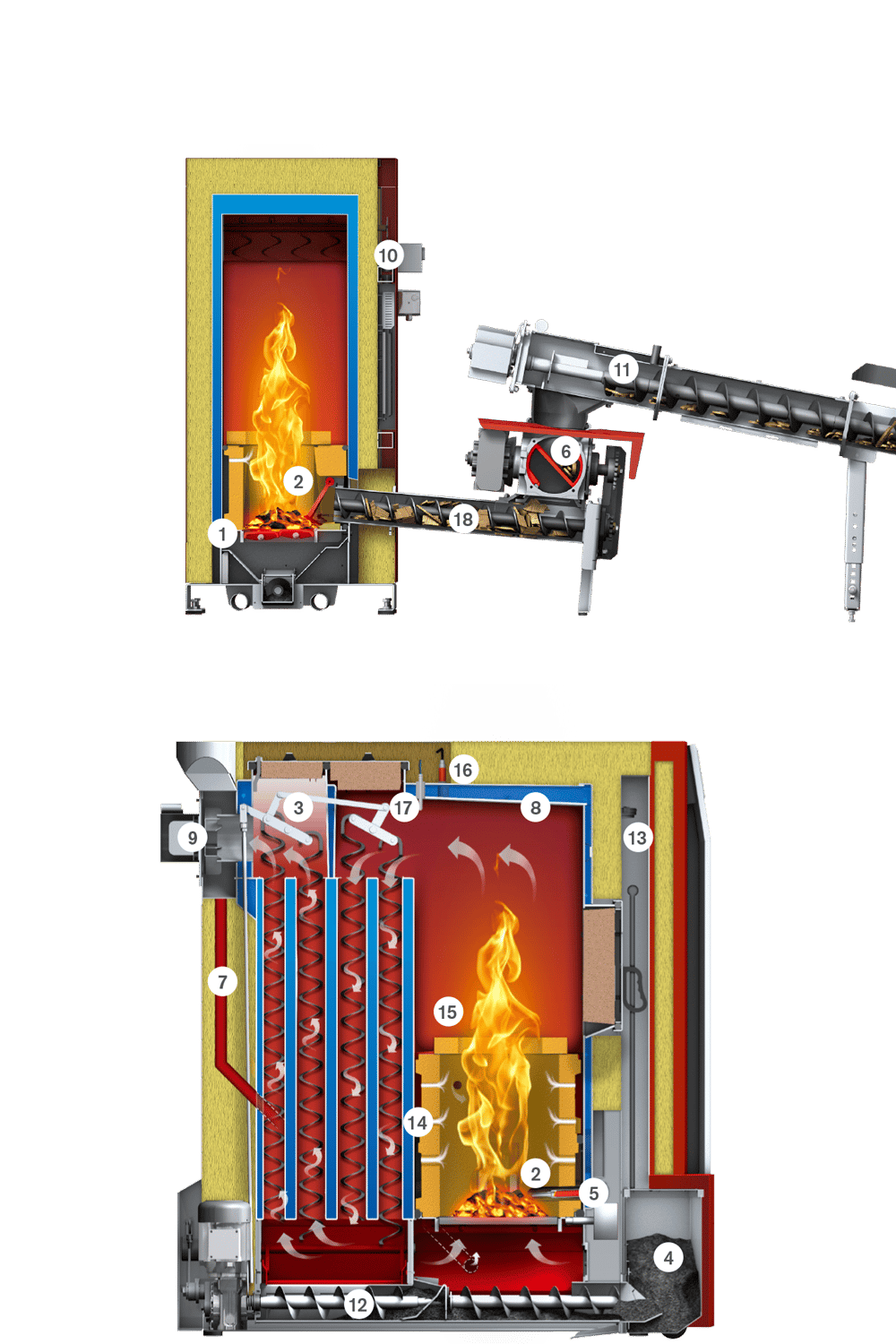 Den robusta konstruktionen med slutna roster och hög eldbädd optimerar förgasningsprocessen och minimerar utsläppen av mikrodamm. Under askutmatningen öppnas endast det bakre roterande rostret så att askan kan falla ner medan glöden hålls kvar för att förbättra förbränningen. Innan pannan startas om öppnas båda rostren för att rensa förbränningskammaren från aska och eventuella främmande föremål. För bränslen med låg asksmältpunkt har rostren dessutom en speciell brytarfunktion som effektivt bryter upp slagg. - Helt keramisk förbränningskammare med rökgasrecirkulation