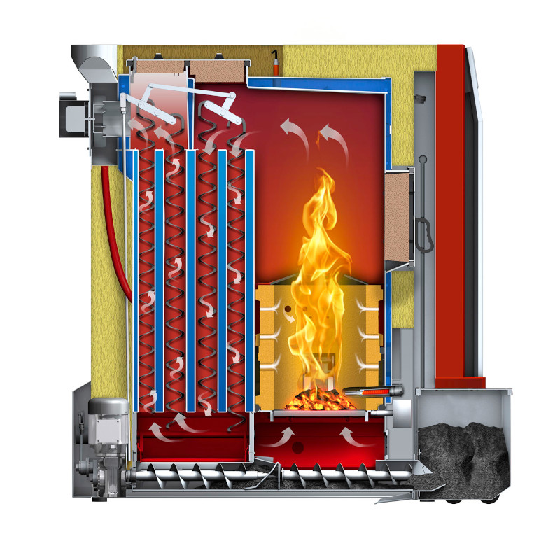 Alla värmeväxlarrör, inklusive första passagen, rengörs automatiskt med jämna intervaller. Turbulatorernas kanter avlägsnar effektivt flygaska som sedan faller ner i askskruven. Där krossas och komprimeras askan innan den samlas upp i en integrerad asklåda. Detta ger en mycket bekväm hantering, högre årsverkningsgrad och minimalt behov av manuell rengöring. För modeller upp till 230 kW räcker en enda drivenhet för både värmeväxlar- och askrengöring, vilket ytterligare minskar energiförbrukningen.