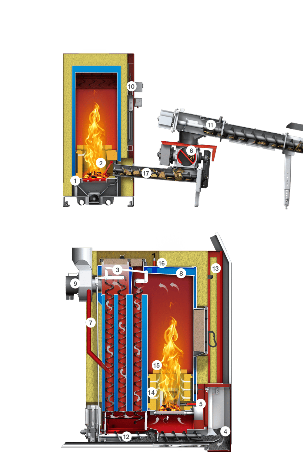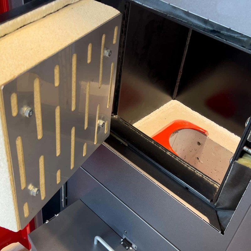 Den robusta konstruktionen med slutna roster och hög eldbädd optimerar förgasningsprocessen och minimerar utsläppen av mikrodamm. Under askutmatningen öppnas endast det bakre roterande rostret så att askan kan falla ner medan glöden hålls kvar för att förbättra förbränningen. Innan pannan startas om öppnas båda rostren för att rensa förbränningskammaren från aska och eventuella främmande föremål. För bränslen med låg asksmältpunkt har rostren dessutom en speciell brytarfunktion som effektivt bryter upp slagg. - Helt keramisk förbränningskammare med rökgasrecirkulation
