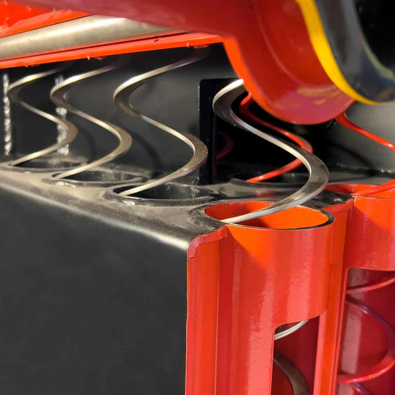Alla värmeväxlarrör, inklusive första passagen, rengörs automatiskt med jämna intervaller. Turbulatorernas kanter avlägsnar effektivt flygaska som sedan faller ner i askskruven. Där krossas och komprimeras askan innan den samlas upp i en integrerad asklåda. Detta ger en mycket bekväm hantering, högre årsverkningsgrad och minimalt behov av manuell rengöring. För modeller upp till 230 kW räcker en enda drivenhet för både värmeväxlar- och askrengöring, vilket ytterligare minskar energiförbrukningen.