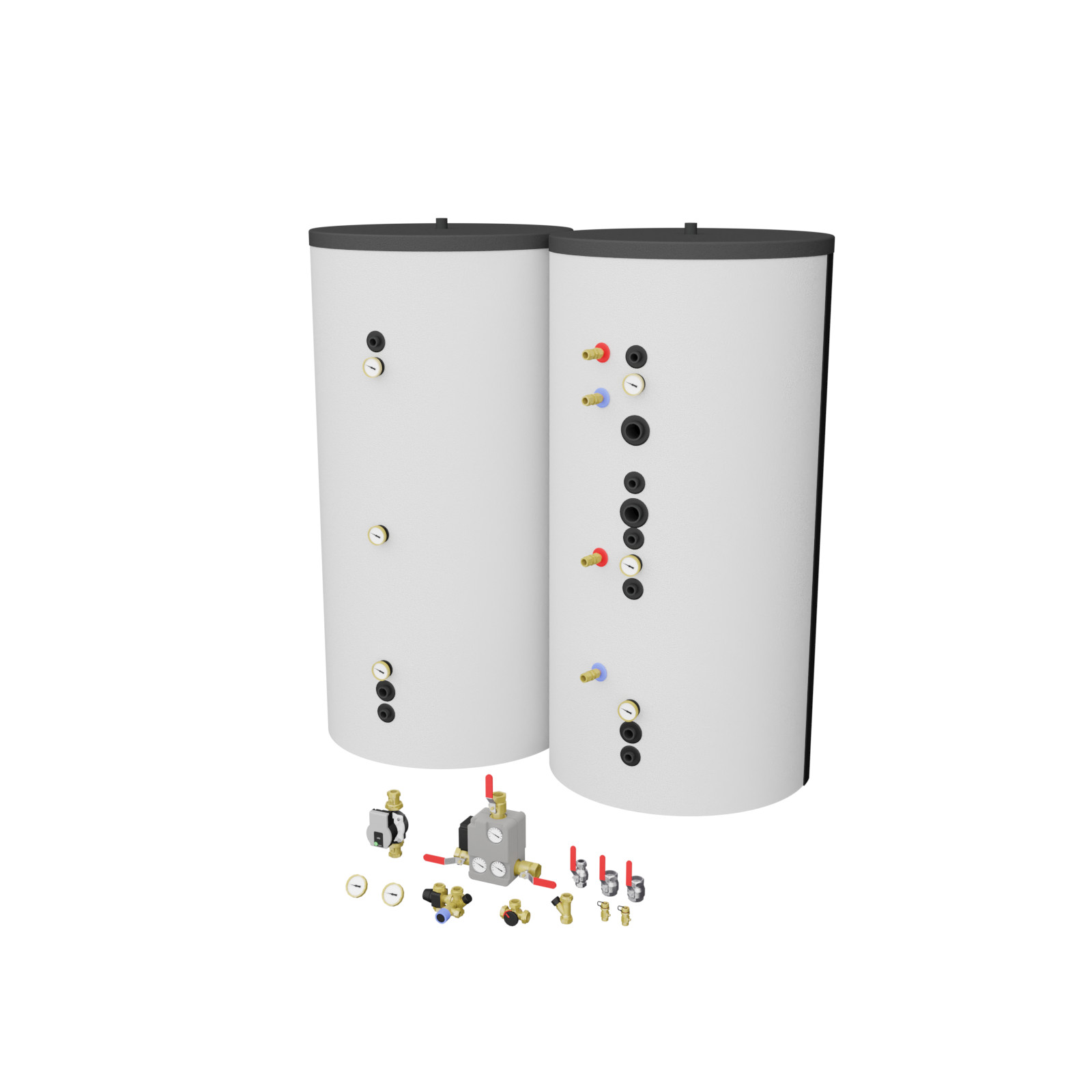Tankpaket B6 vårt tankpaket med två färdigisolerade ackumulatortankar i storleken 750L varav en med dubbla 9,5m slingor. Totalt vattenvolym är 1500L. Tankpaketet innehåller också övrig nödvändig utrustning som laddningspaket, shunt, cirkulationspump mm.