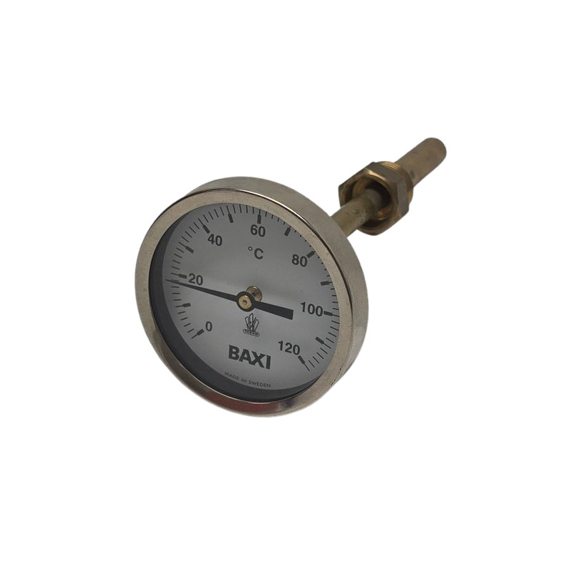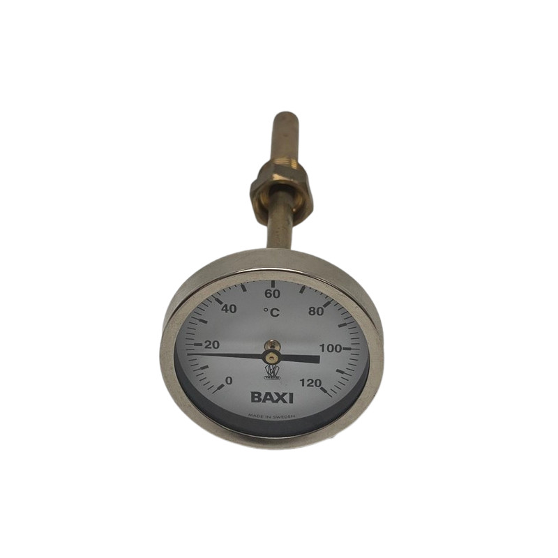 Termometern har en 100mm hals, dvs den är gjord för ackumulatortankar där den behöver gå igenom ett lager med isolering innan den monteras i tanken.